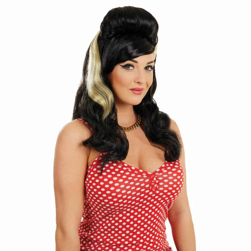 Transform yourself into a pop icon with this long black beehive wig. Great for music inspired fancy dress parties channelling Miss Winehouse & also 1950s vintage events. Team it with our Rockabilly dress if you’re going for the full 50s look.