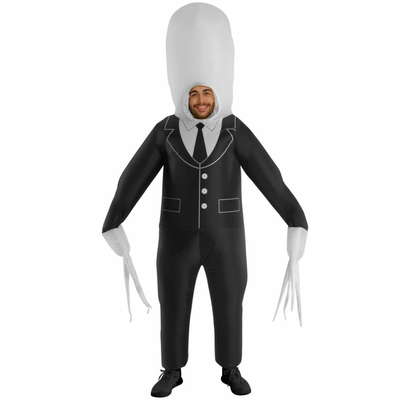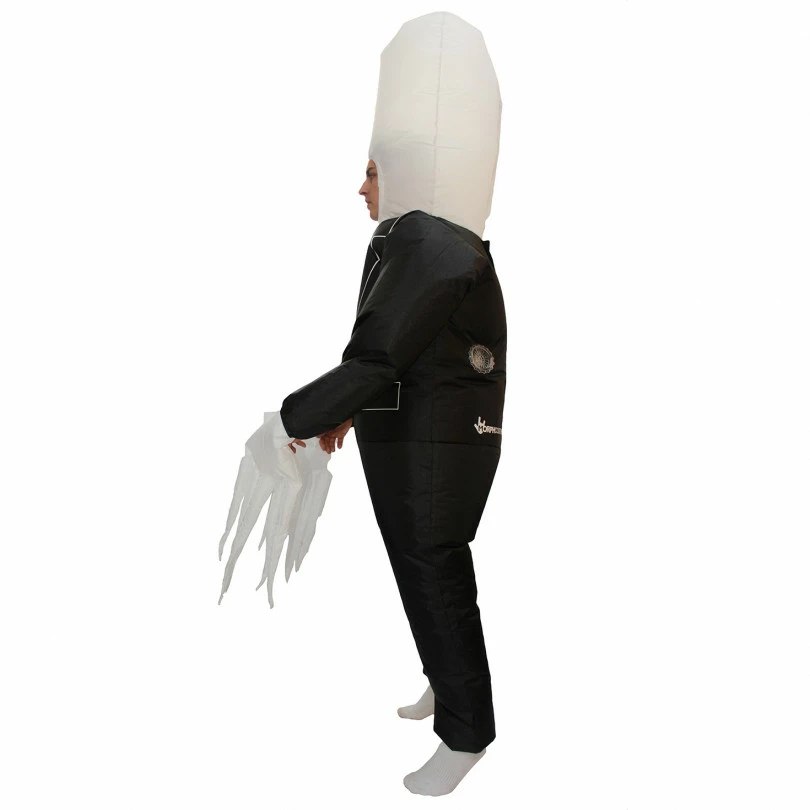 He has no eyes but is always watching. He has no face, extendable arms, is crazy tall, and is scary as hell! Our Giant Inflatable Slenderman Costume is all of these things and more… Slenderman is one of the most classic Urban Legends that has emerged from the depths of the CreepyPastas forum. The man with no face and extensible arms that lurks in forests and skulks around abandoned places, waiting to torment. He usually doesn’t strike right away – he could haunt you for years until he decides to brutally kill you. Mentally however… He begins to drive you insane you as soon as you take one look at him. Scared yet? How the costume works: step into the costume and turn on the fan, wait for the costume to inflate which will only take a minute or so, then boom! Your inflatable costume is ready to go! The fan is powered by 4 x AA batteries which should last 4+ hours. We don’t include batteries with this costume. Sorry about that!”””