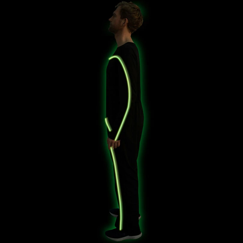 Green Glow Stick Man Costume – Glow up in this light and bright stick man costume! The black suit with green light up wire is perfect for Halloween or any costume party. With battery operated lights creating the stick-man effect, this is the easiest and coolest costume we think we’ve ever created. Let this costume shine and why not complete the look with our one of our Screaming Demon Masks?How it works: Just pop 2 x AA batteries into the battery pack (batteries aren’t included, sorry), turn it on, put on the suit and you’ll be ready to rock the night away! The suit has 3 light settings: constant light, fast flashing light, and slow flashing light. Change from each setting by pressing the button on the battery pack.