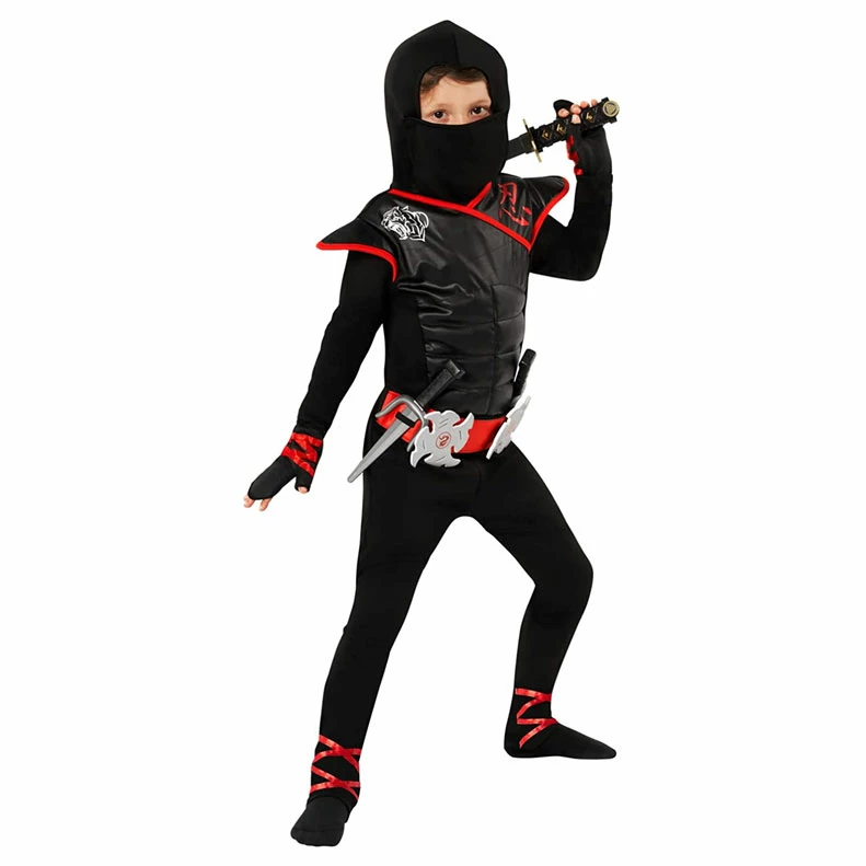 This superb quality kids’ costume will see your child transformed into the fabled black & red deadly ninja. Silently stalking the shadows, no ninja would dare leave home without their trust daggers and throwing stars; fortunately, these are included with the costume. This costume is perfect for book week, Halloween or any other dress up occasion (who needs an excuse to be a ninja really?)