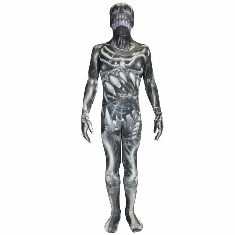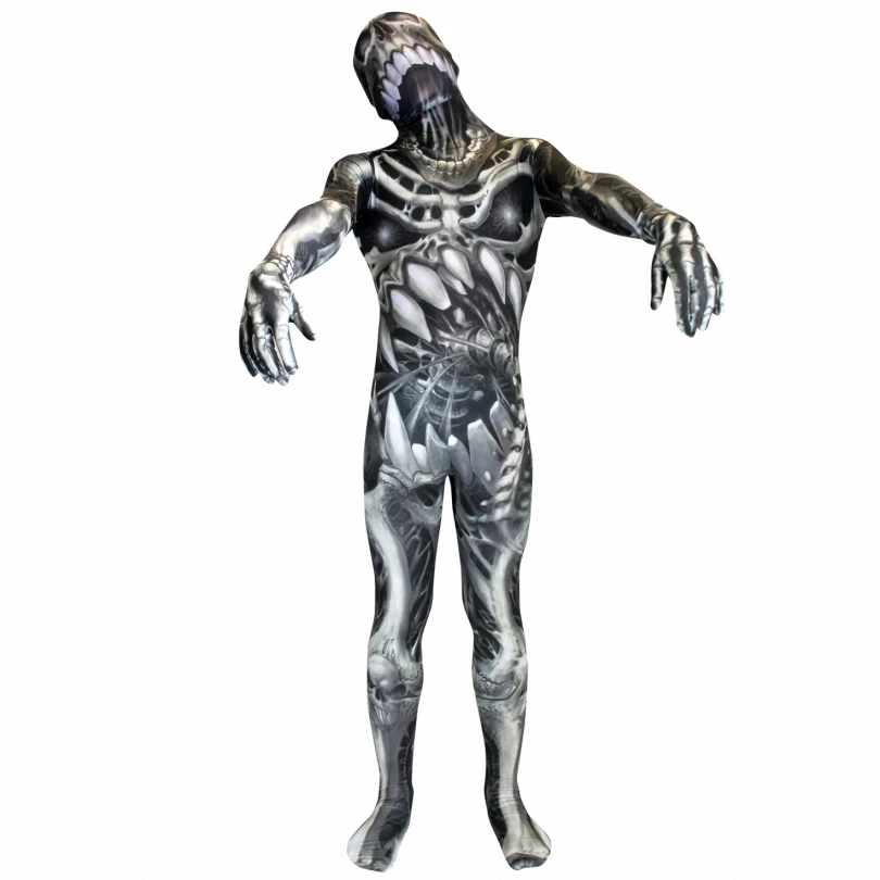 The kids’ skull and bones Morphsuit is an extremely creepy horror costume that will scare the bejesus out of anyone your child sees during Halloween or at fancy-dress parties. This is no ordinary skeleton design, as you’ll see a contortion of twisted bones and a horrific skull face thanks to the high-quality all-over print on this outfit. The kids’ skull and bones Morphsuit costume is crafted from a superior blend of fabrics to deliver a superbly comfortable fit and excellent vision as your child wears it.