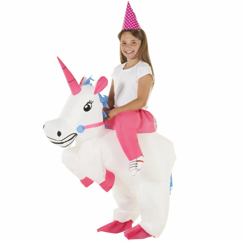 This fantastically fun kids’ inflatable Ride On unicorn costume lets your child ride around any party or event with their very own personal unicorn. This kids’ costume is perfect for girls, but boys can wear it too of course. It’s bound to be a real head-turner at absolutely any Halloween event or any occasion that requires them to dress up. Our Ride On outfits are hugely popular wherever they are worn.