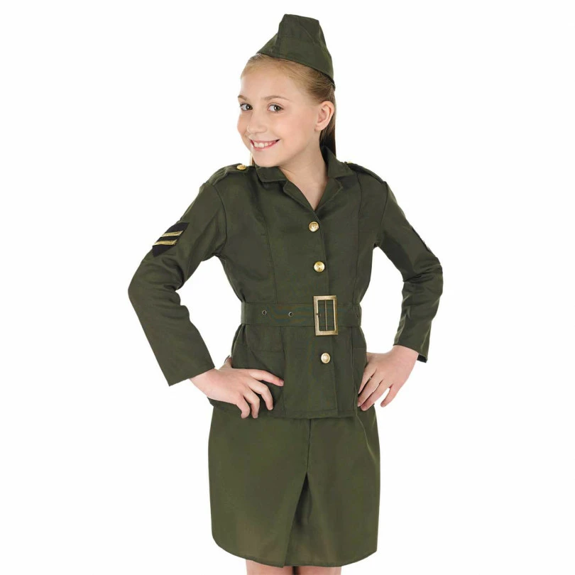 With the kids’ WW2 army costume, your daughter will be able to step back in time to an era where the Blitz spirit ruled and loose lips sank ships. This brilliant girls’ costume comes with an authentic looking design based on historical photographs and is ideal for school plays, theatre productions, reenactments and Book Week. The girls’ WW2 army costume comes with an olive-colored jacket and skirt, with a belt-tie around the waist.
