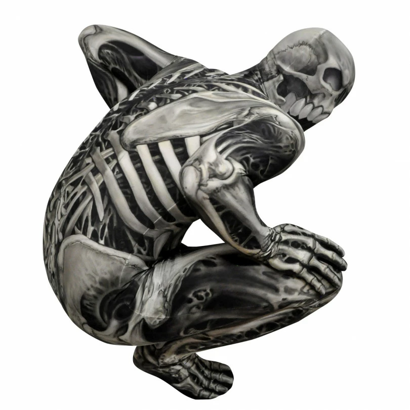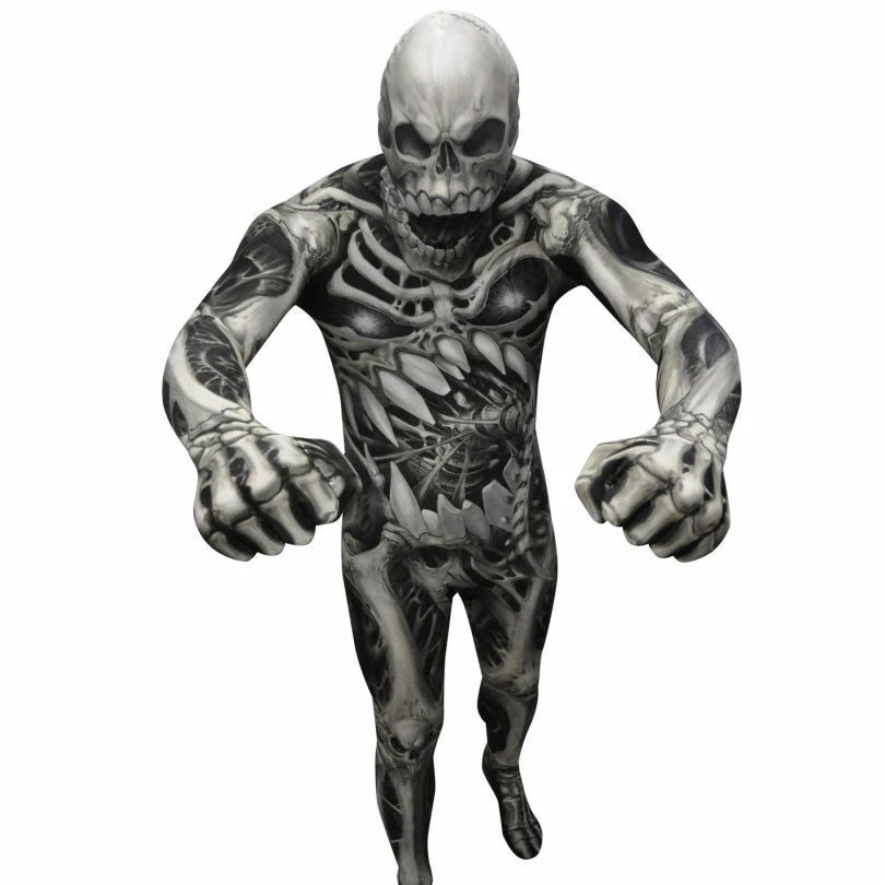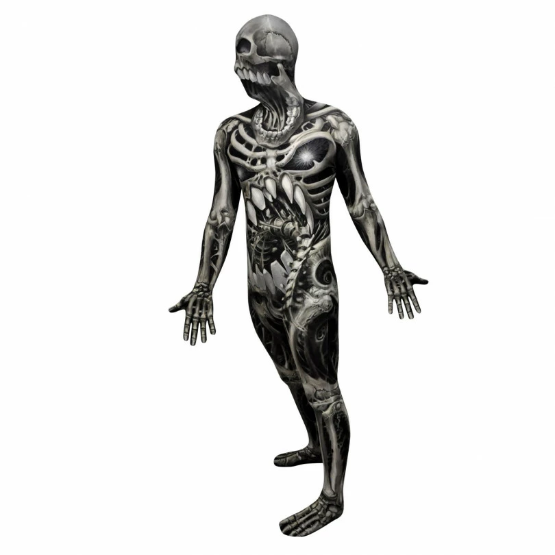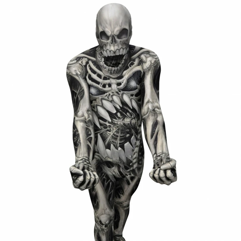 The adults’ skull and bones Morphsuit is an extremely creepy horror costume that will scare the bejesus out of anyone you see during Halloween or fancy-dress parties. This is no ordinary skeleton design, as you’ll see a contortion of twisted bones and a horrific skull face thanks to the high-quality all-over print on this outfit. The skull and bones Morphsuit costume is crafted from a superior blend of fabrics to deliver a superbly comfortable fit and excellent vision as you wear it.