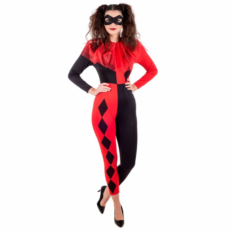 This jester style catsuit is perfect for Halloween parties, cosplay, festivals & clowning around at carnivals. Inspired by an iconic female comic book antihero, the women’s Harlequin costume is a sure-fire winner for any occasion. Each costume includes a detailed catsuit, neck ruffle and mask.