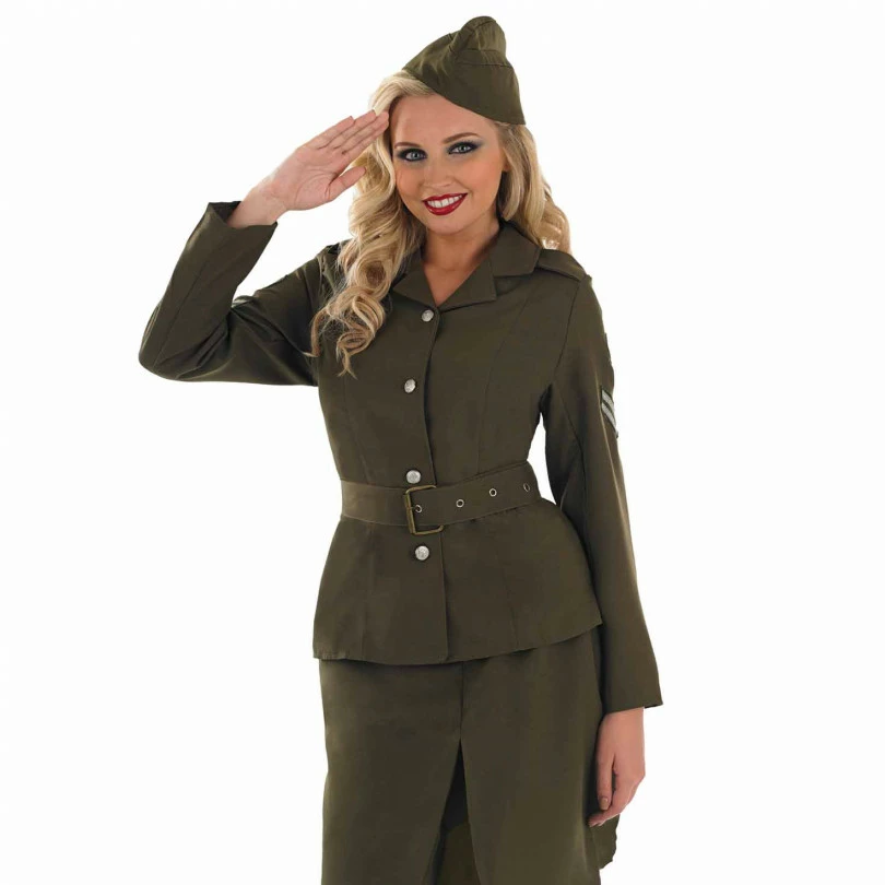 Become part of the women’s WWII home effort with the ladies WWII army uniform costume. Well-suited to theme or decade parties, this outfit helps you bring a little slice of history hurtling into the present day. The women’s WWII army uniform costume comes with a military style jacket, skirt, hat and belt.